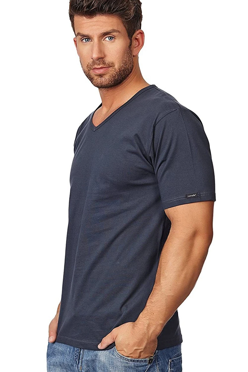 Мужская классическая хлопковая футболка Cornette 202 с короткими рукавами и V-образным вырезом горловины, на рукаве металлическая пластина с логотипом Cornette.
