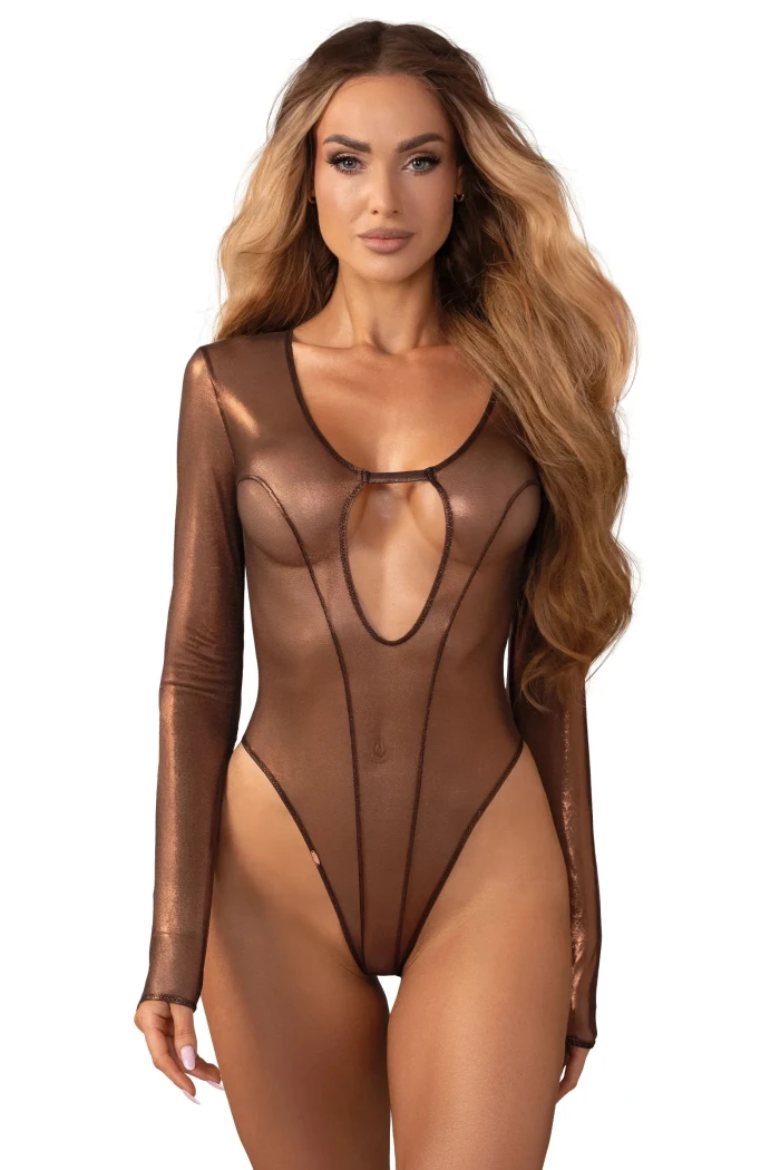 Элегантность и чувственность в одном образе – этот боди увлекает своей нежной, золото-мерцающей тканью, которая окутывается вокруг тела, как вторая кожа. Длинные рукава придают нотку изысканности, тогда как прозрачная ткань дразнит и интригует. Идеально подходит для особых случаях или интимных моментов, когда вы хотите очаровать и удивить.