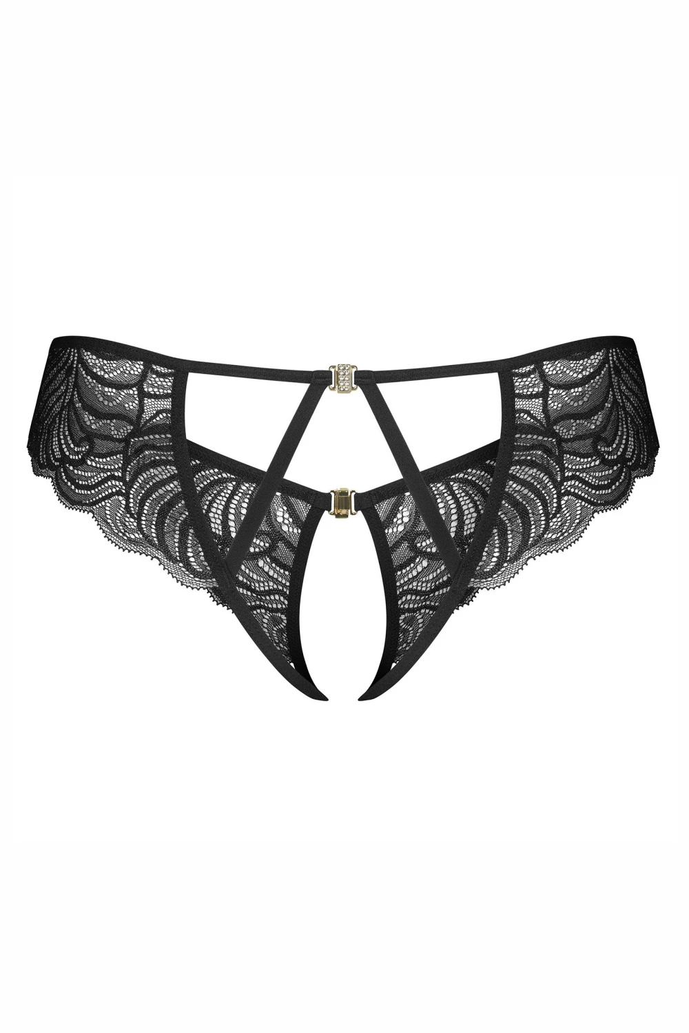 Стринги Divienne – это слияние кружева, которое подчеркивает женскую деликатность и смелый дизайн. Ремешки создают интригующую, геометрическую композицию на ягодицах. Центральный элемент золотого оттенка придает роскошный штрих и привлекает внимание. Элегантная и провокационная модель – именно такая, как вам нравится.