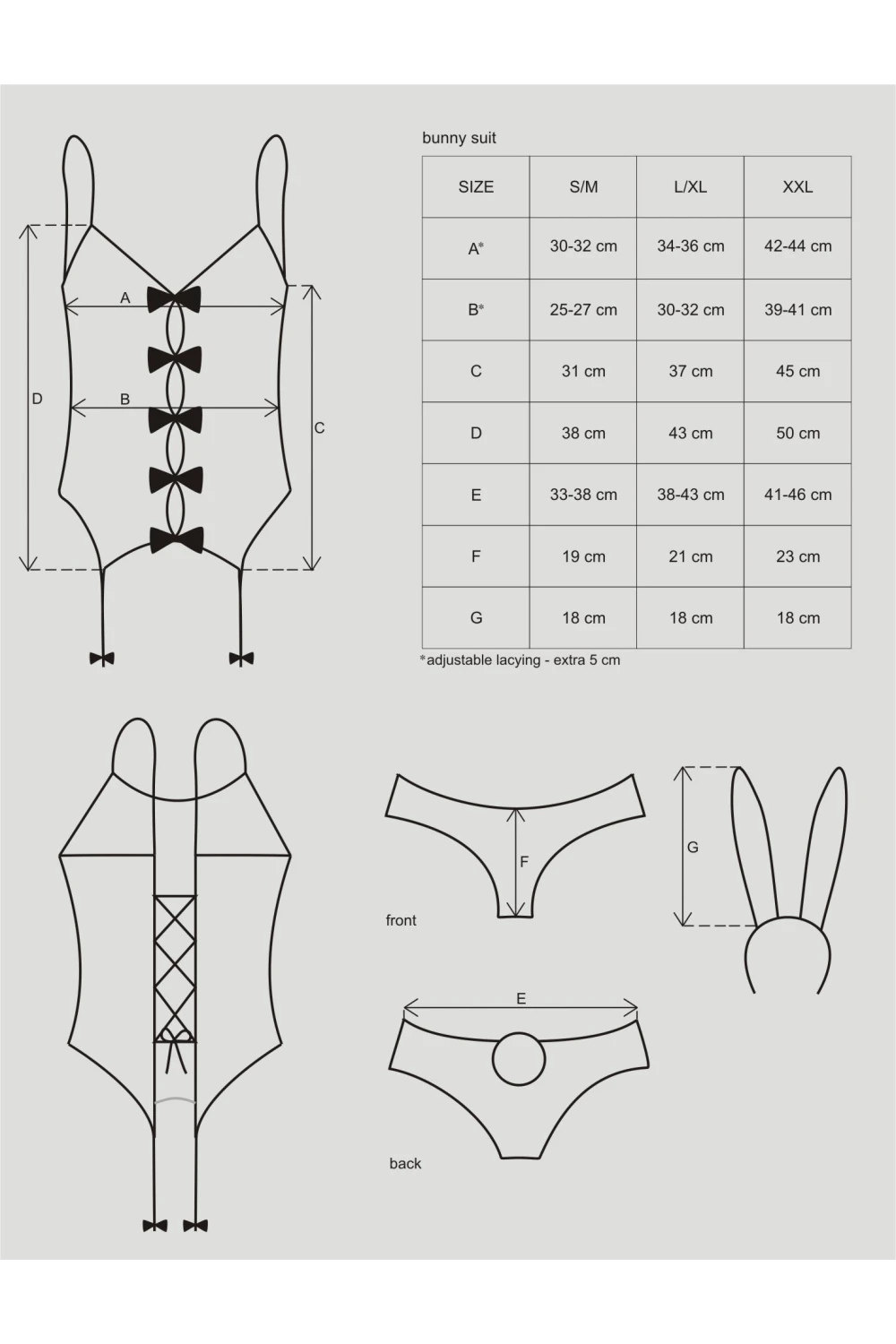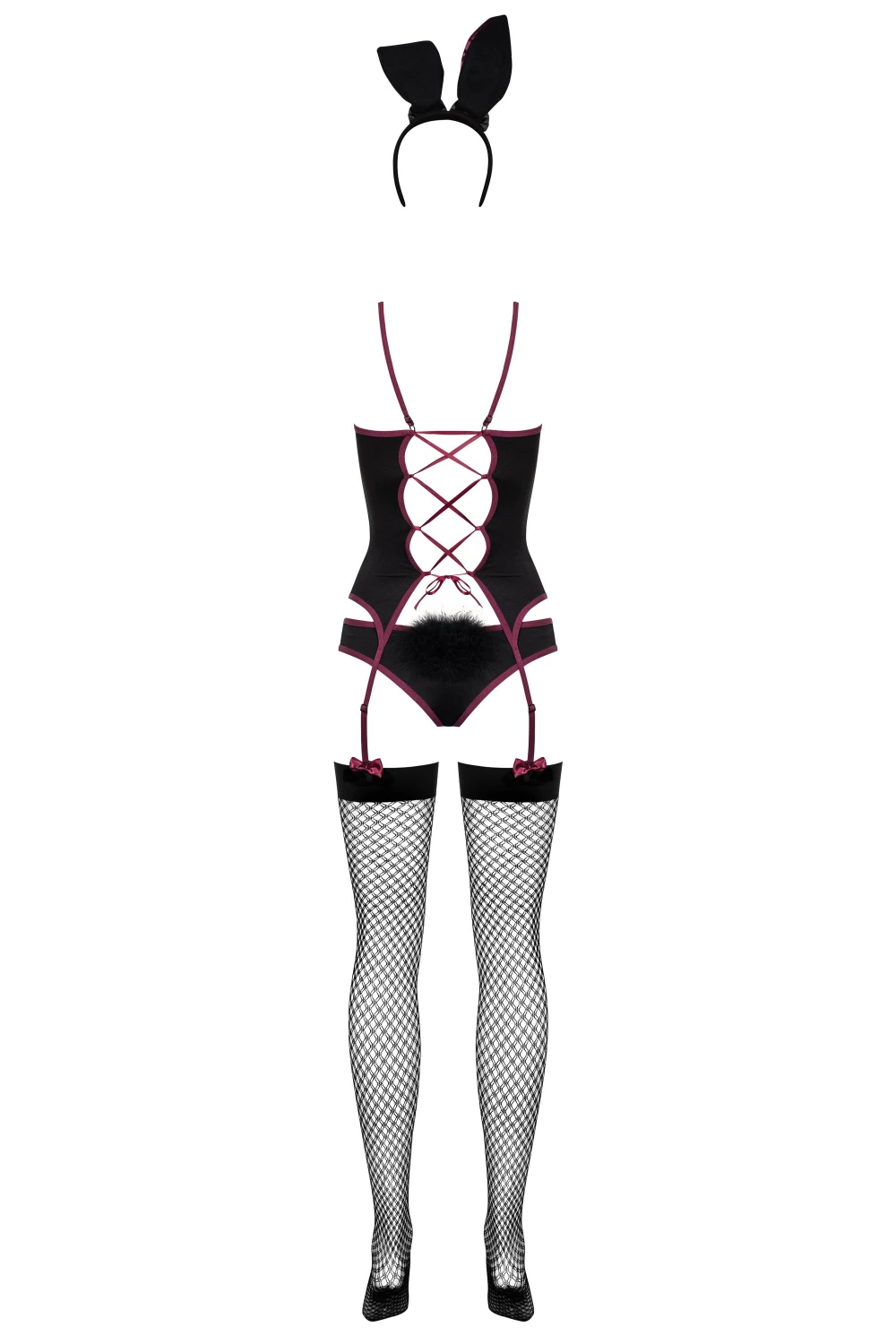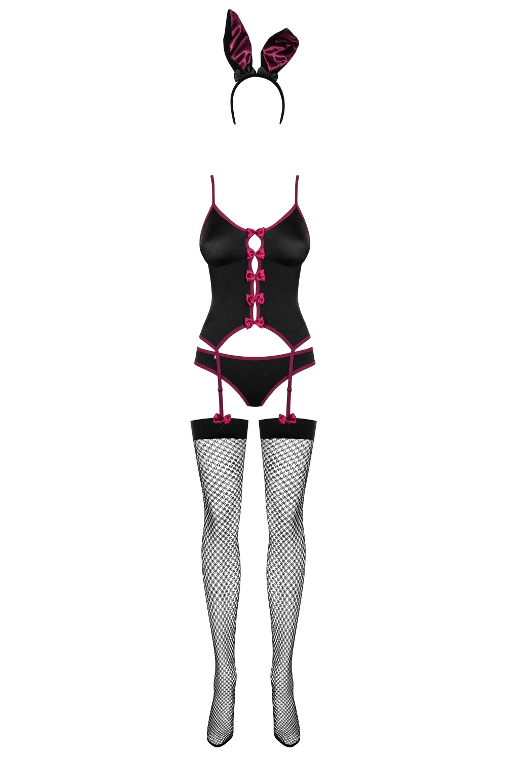 - В комплекте: корсет-топ с пажами для чулок, трусики, чулки в сетку и сатиновые ушки на обруче для волос.