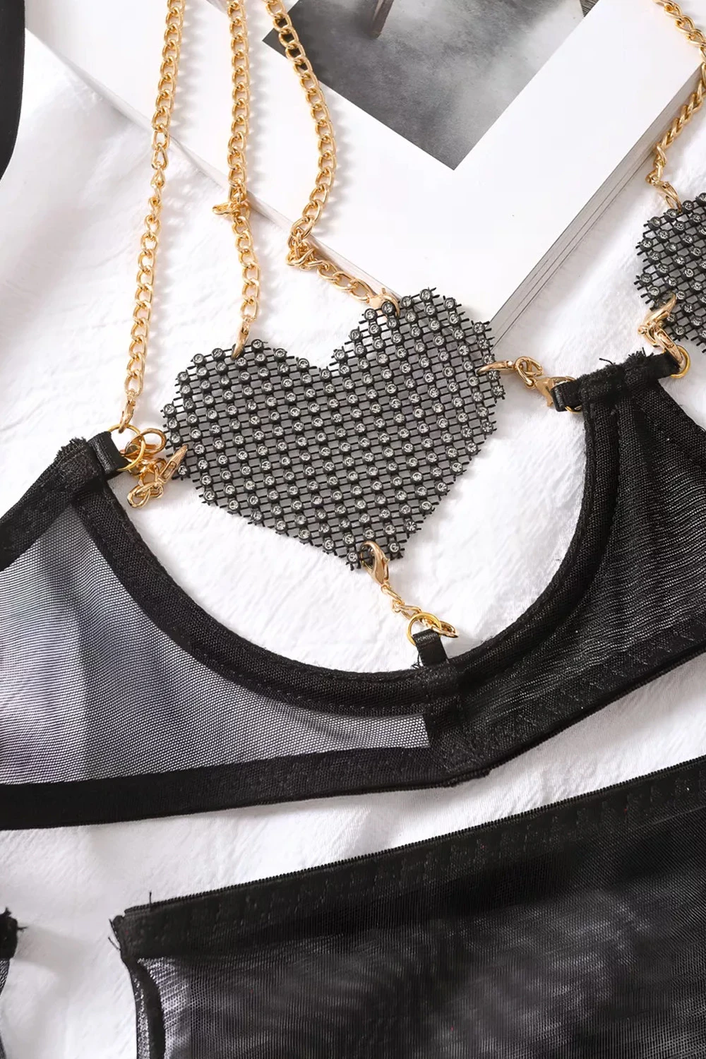 - Открытые чашечки бюста соблазнительноукрашены накладками в виде сердечек на цепочках.