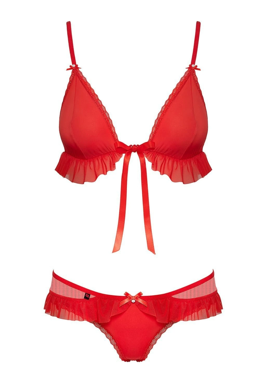 - Мягкий лиф с треугольными чашечками, декорированный нежными оборочками под линией груди, застегивается спереди.