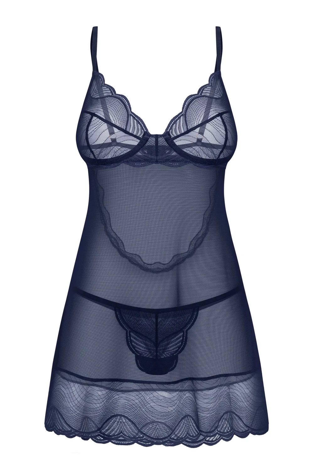 Комплект Nightly Blue, где вневременная элегантность и чувственная привлекательность создают идеальную гармонию. Эта темно-синяя рубашка, изготовленная из мягкой, прозрачной сетки, имеет нежные кружевные акценты и волнистый край, изящно подчеркивающий женскую фигуру, а стринги из роскошного кружева придают легкую привлекательность.