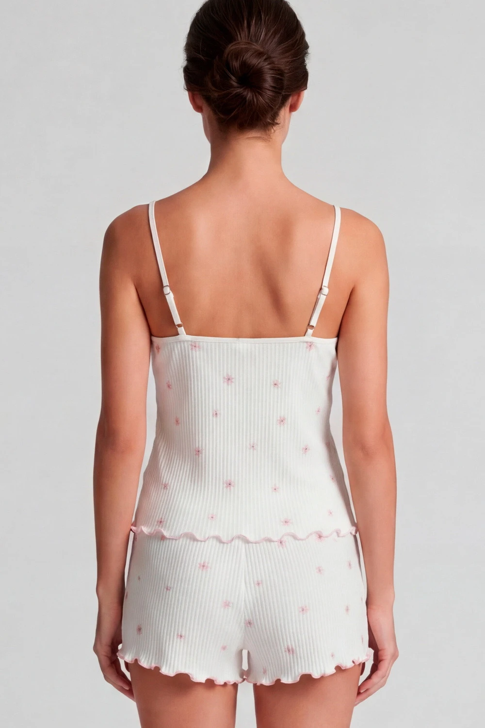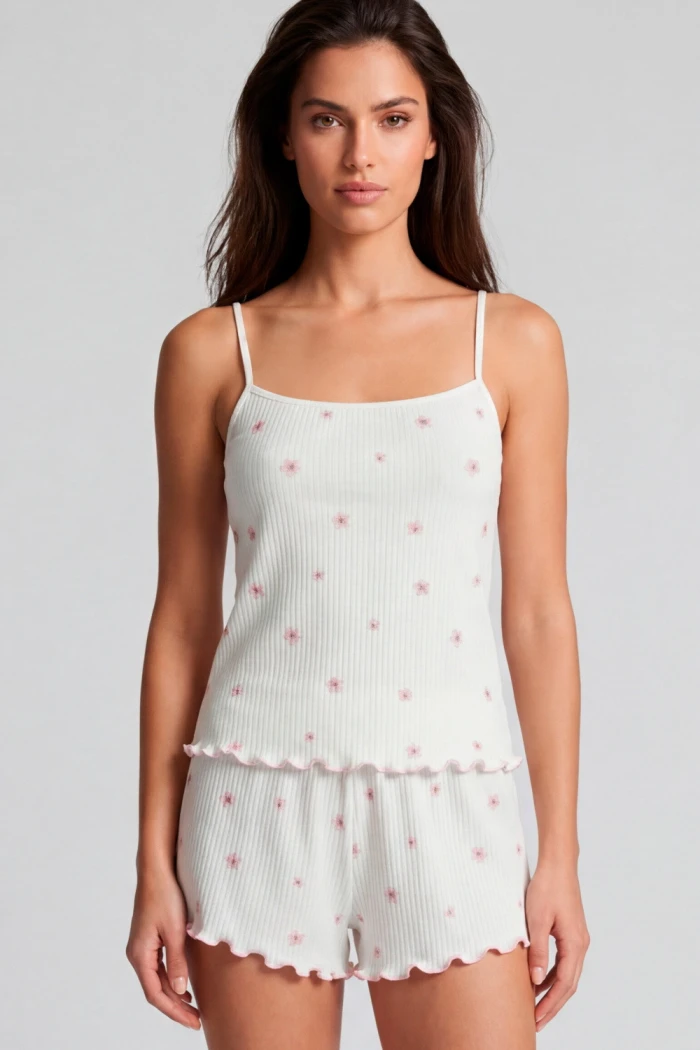 - Майка на тонких бретелях акуратно підкреслює плечі та виглядає лаконічно, а шорти з еластичною посадкою не сковують рухів і забезпечують зручність протягом усього часу носіння.