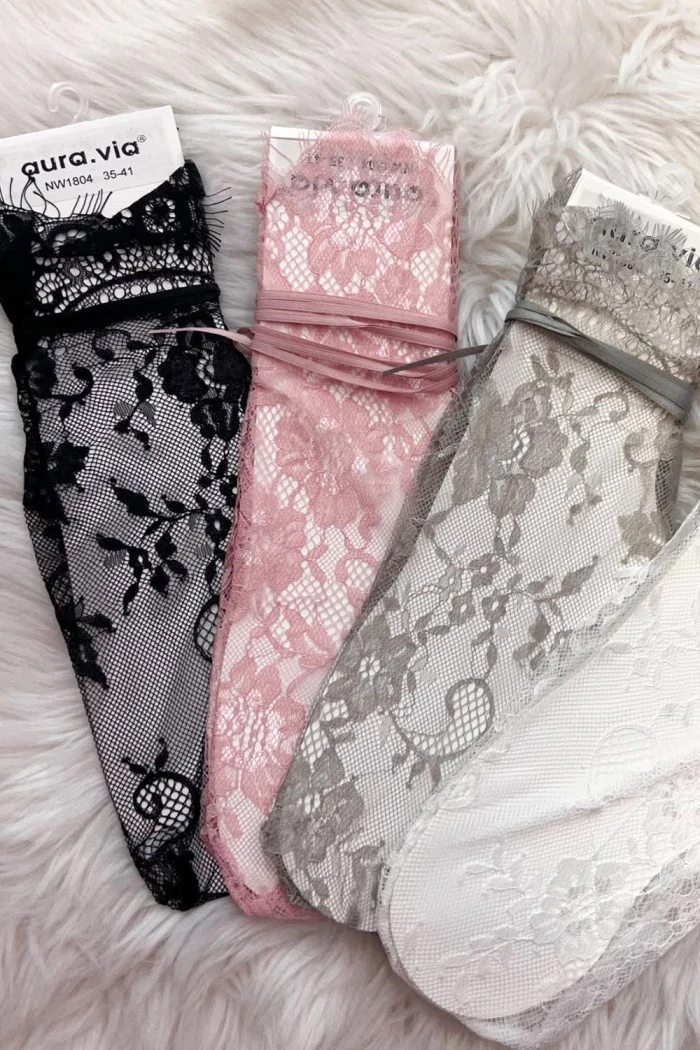 Прозорі жіночі шкарпетки із мережива Aura.Via NW1804 прикрашені атласними стрічками підійдуть як для високих підборів, так і у вигляді цікавого доповнення в повсякденних стилізаціях.