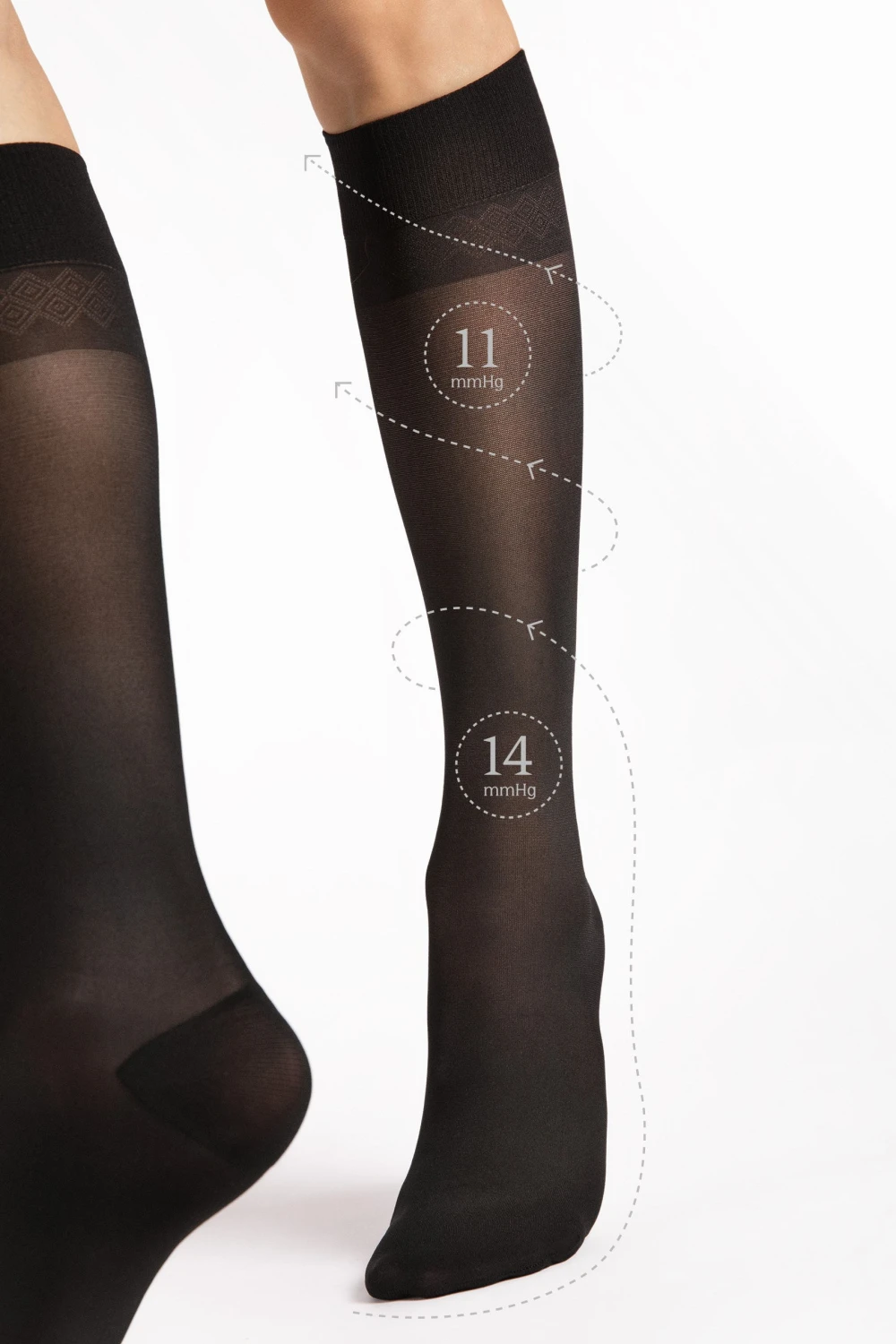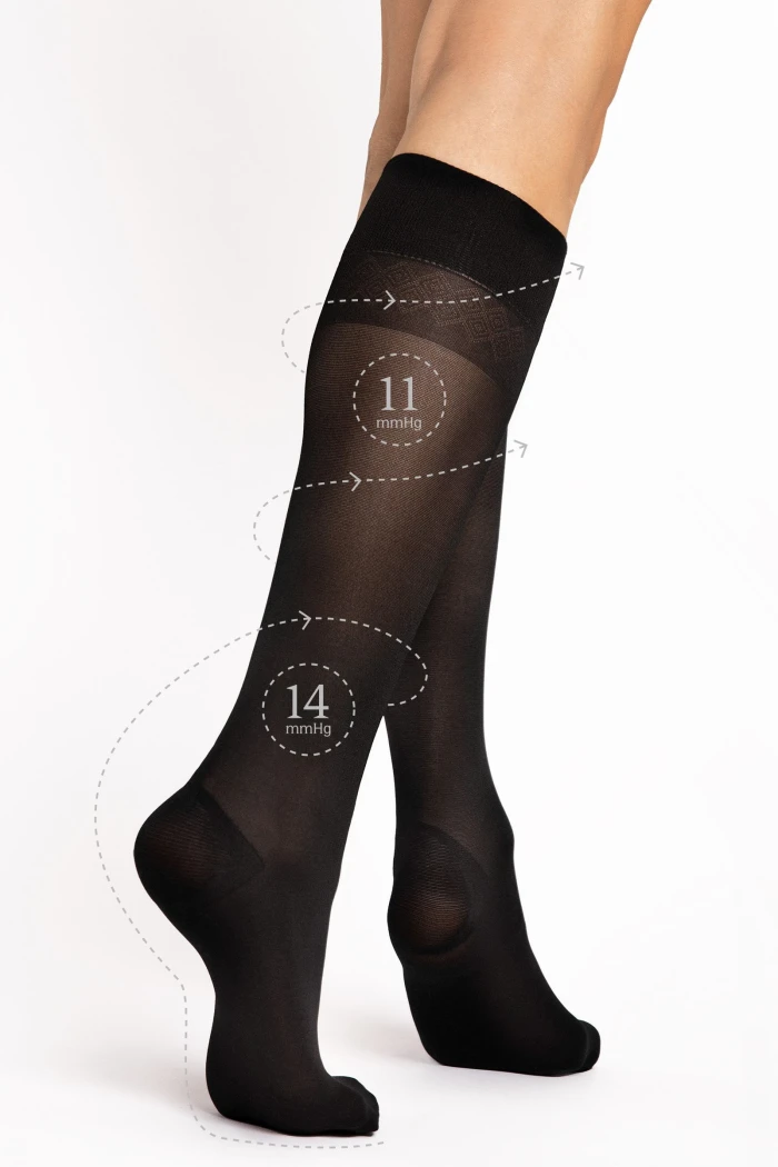 Fiore Travel 30 компресійні гольфи з стисненням 11–14 мм рт.ст., що робить їх чудовим вибором для профілактики варикозного розширення вен. Гольфи допомагають поліпшити кровотік, зменшити набряк і відчуття важких ніг, а також забезпечують помітне полегшення від втоми. Посилена частина в зоні пальців і п'яти забезпечують довговічність. Також ідеально підходять для людей з сидячими або стоячими робочими місцями.