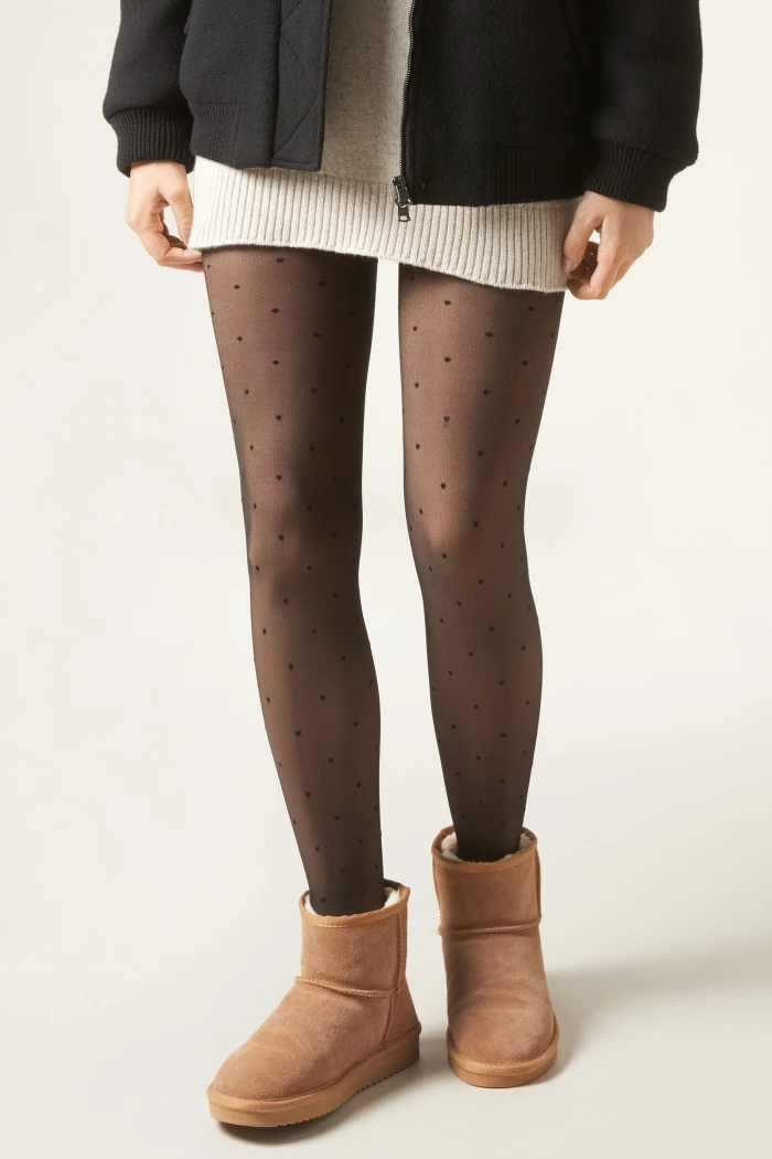Щільні колготки з завищеною посадкою прикрашені дрібним горошком (крапочками) по всій довжині.