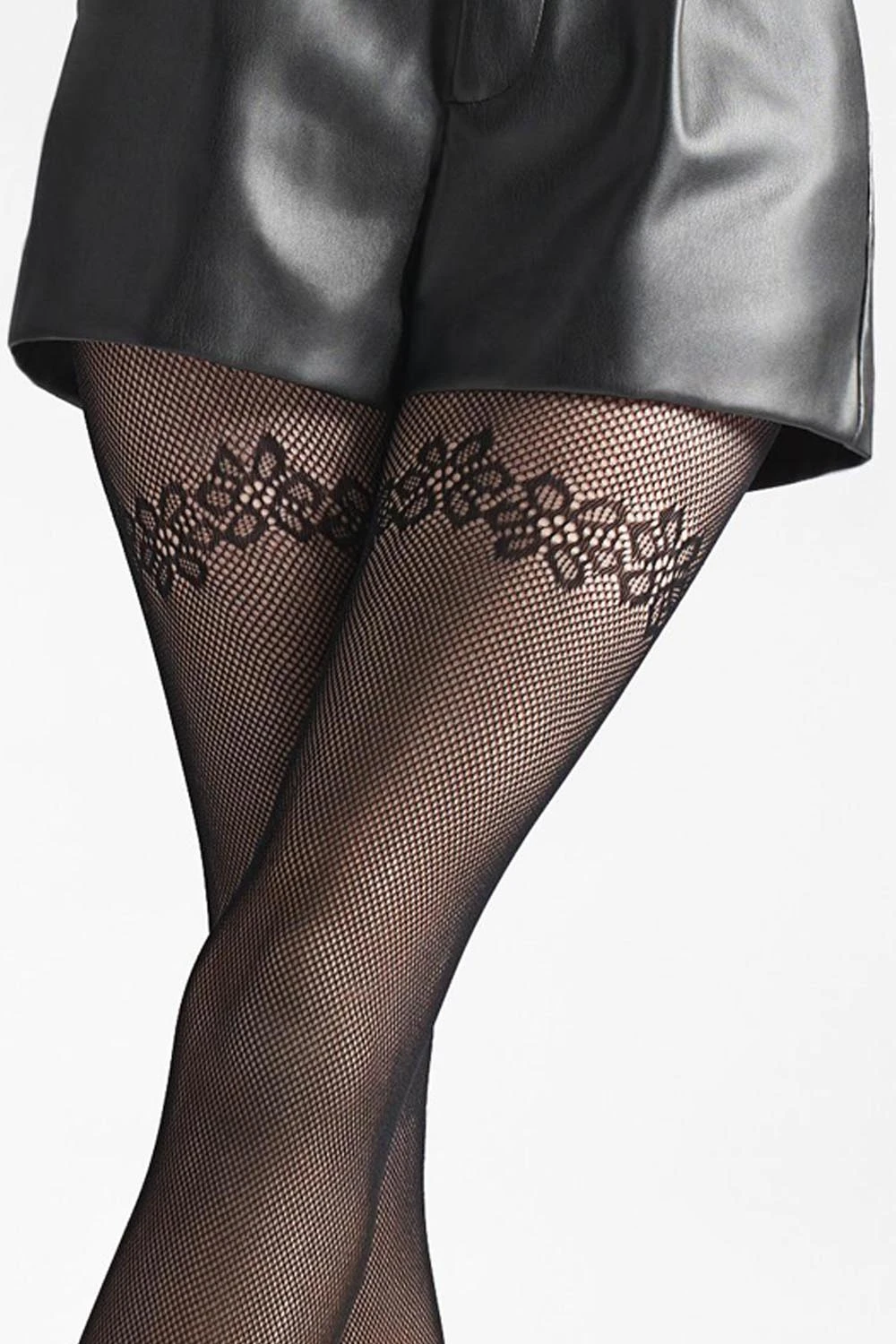 Оригінальні колготки в сітку Marilyn навколо стегна прикрашені квітковим візерунком. Колготки відмінно поєднуються зі спідницями, сукнями і шортами короткої і середньої довжини.