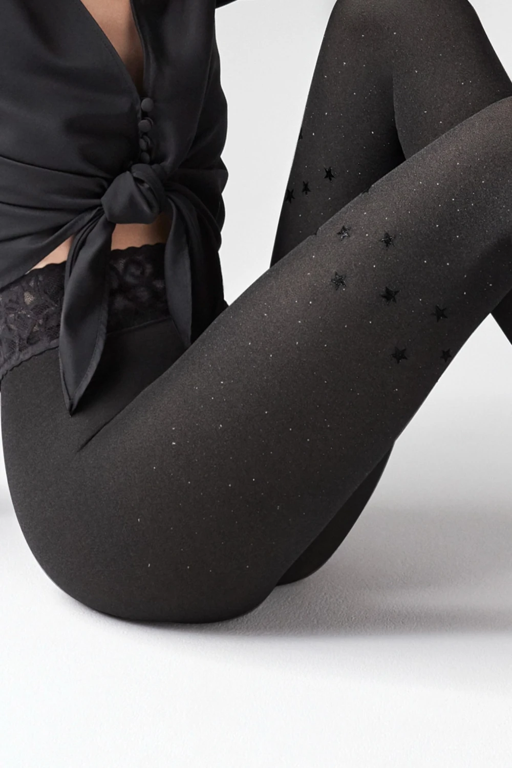 Неймовірно ефектні фантазійні колготки Marilyn EMMY N07 з люрексовой напиленням, на стегні прикрашені дрібними зірочками. М'які, приємні на дотик колготки - ідеальне рішення для ваших ніжок в холодну пору року.