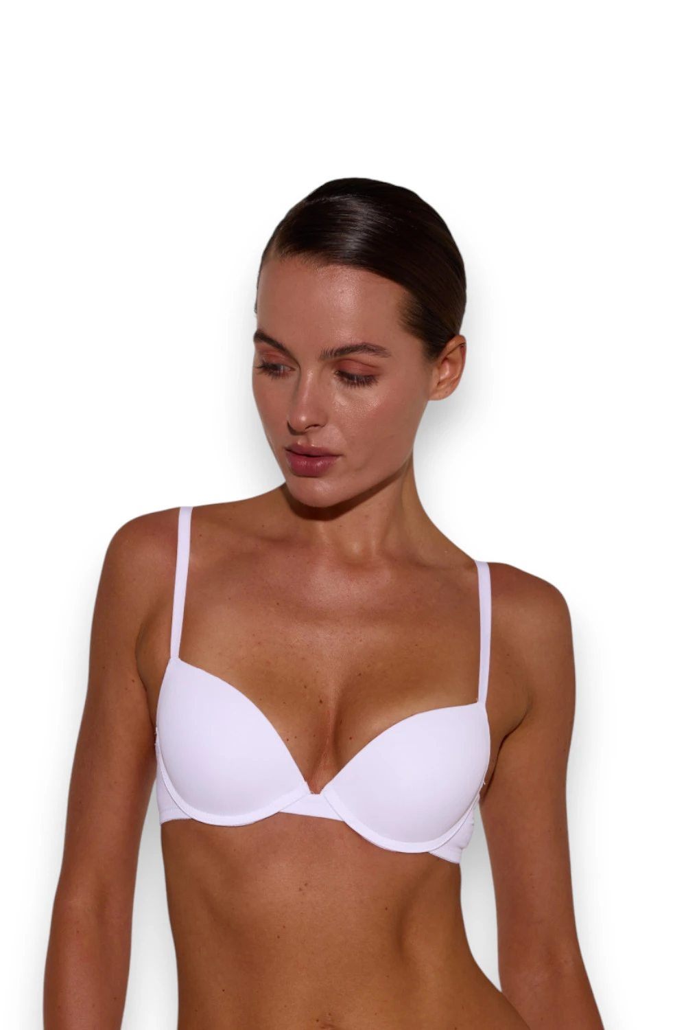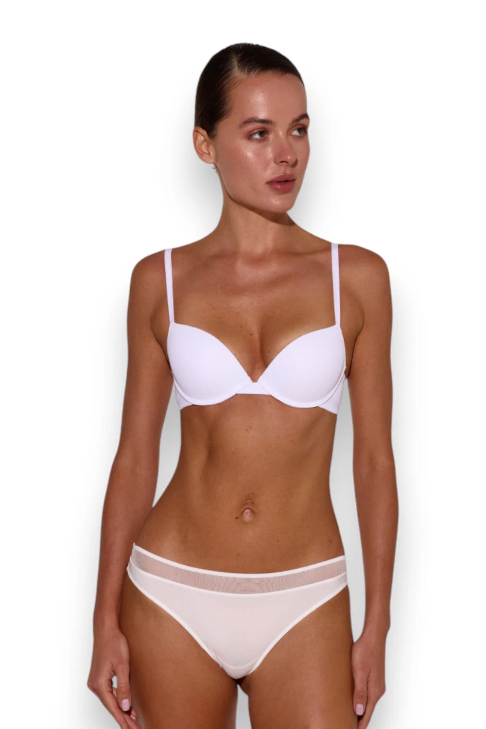 Бюстгальтер із push-up акуратно збирає груди та піднімає їх вгору. Конструкція має тонке з'єднання чашок по центру, що відкриває лінію декольте.