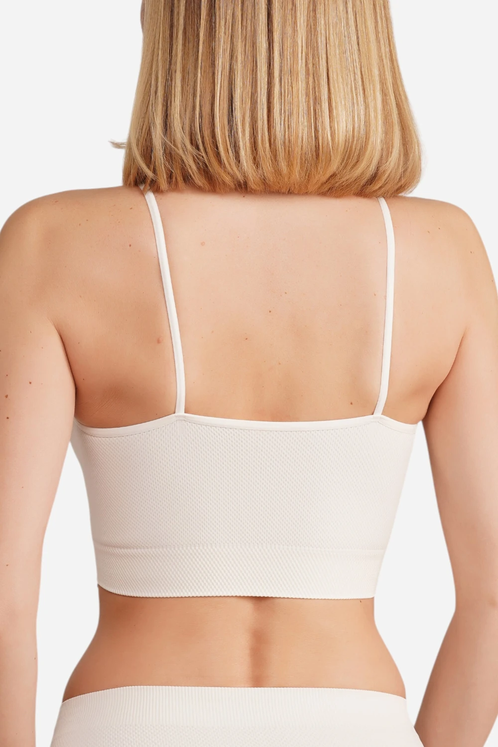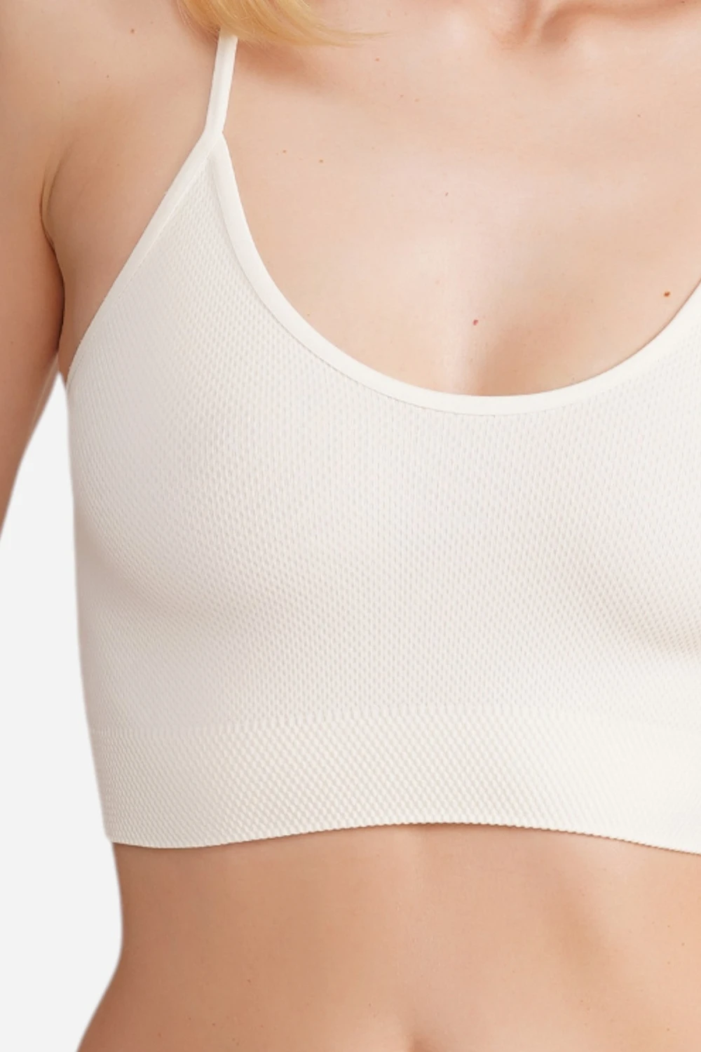 Безшовний бюстгальтер-топ на тонких бретелях виконаний з м'якої фактурної мікрофібри без швів.