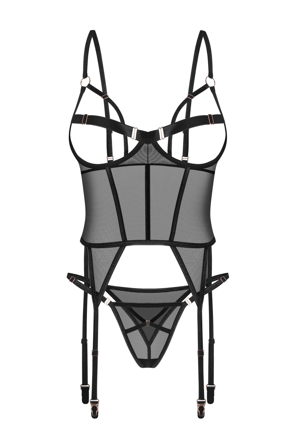 Сміливий і неймовірно жіночний корсет з відкритими чашечками бюста та трусиками від Obsessive є захоплюючою сумішшю прозорої сітки з тонкими прозорими смужками і дизайном, який підкреслює кожен вигин тіла. Бюст красиво відкриває груди і формує спокусливе декольте, в той час як прозора тканина підкреслює форми, залишаючи достатньо для фантазії.