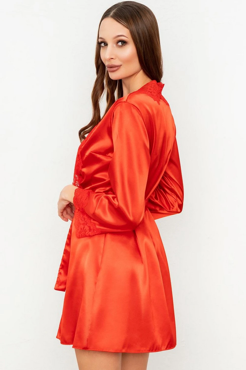 • Елегантний халатик до середини стегна і з рукавами 3/4 зав'язується на запах за допомогою тонкого атласного поясу.