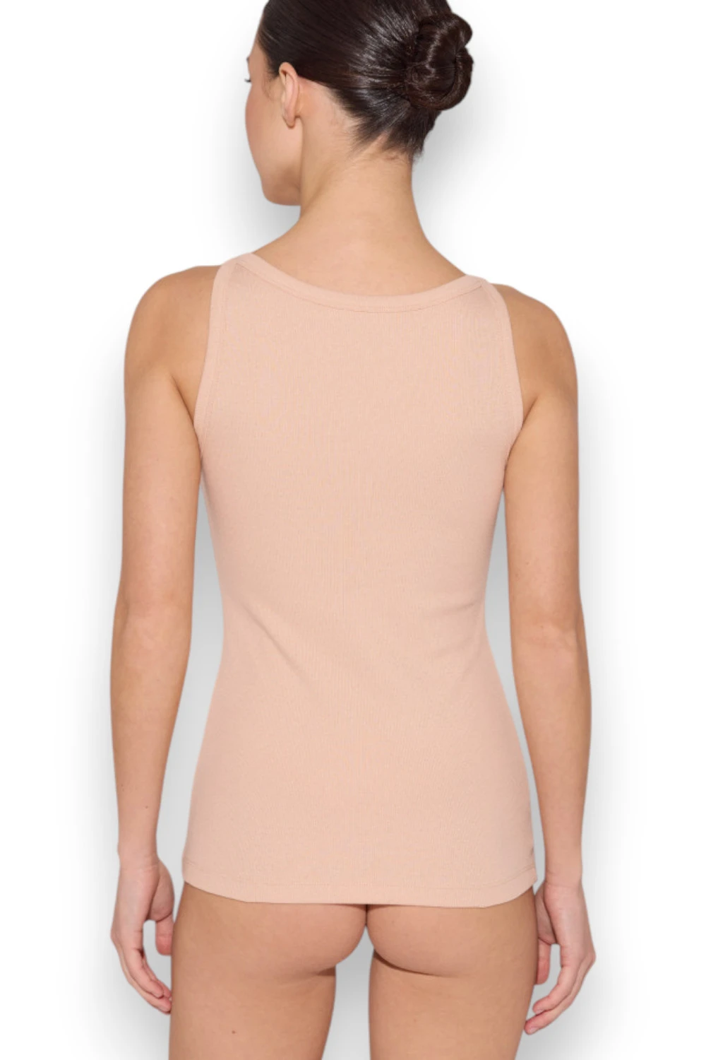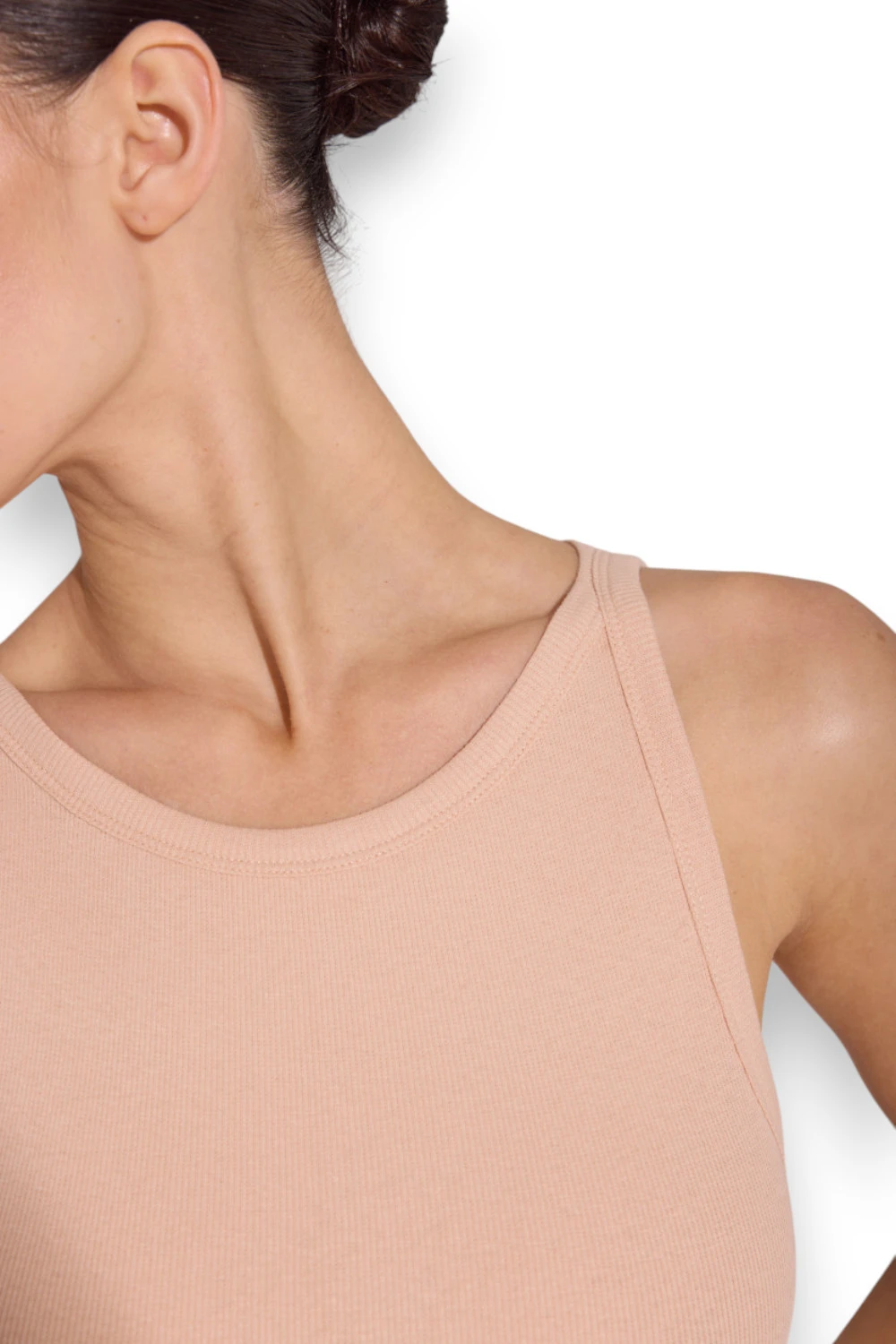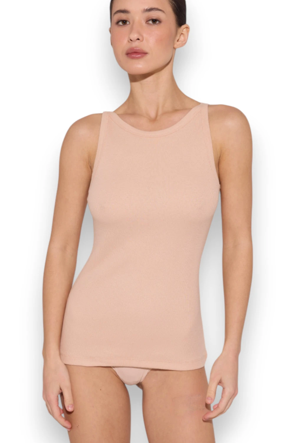 Приталена майка із м'якої бавовни в рубчик з високим вирізом та широкою подвійною обробкою швів. Стильна трендова майка цього сезону, буде чудовим доповненням до базового образу.