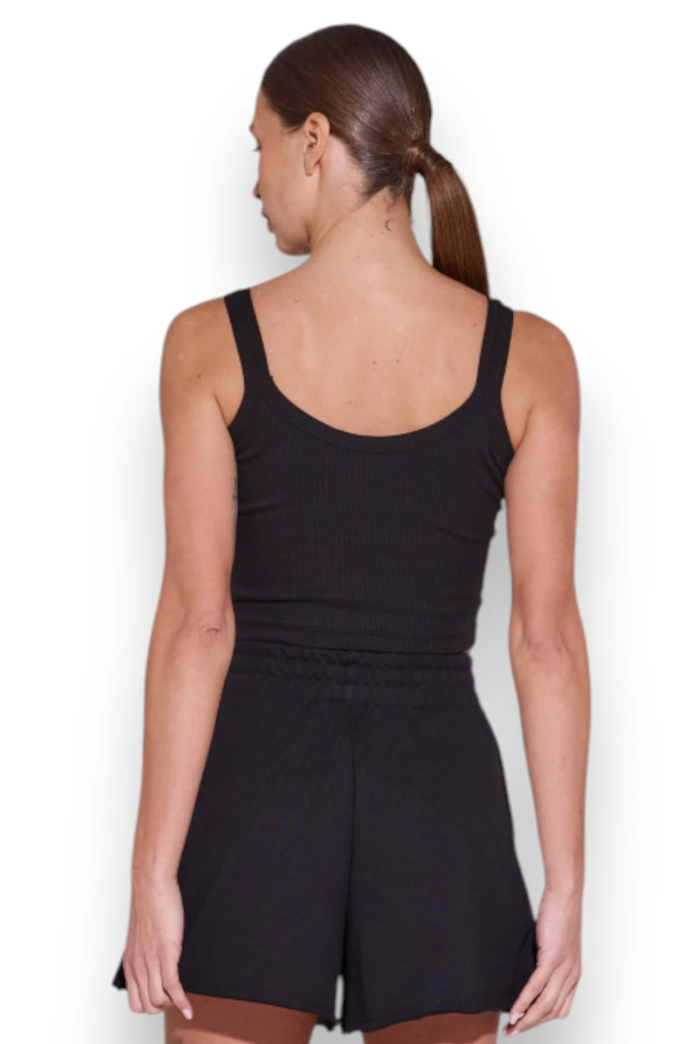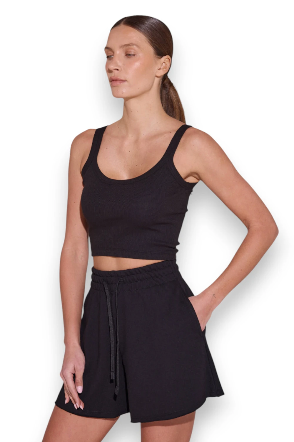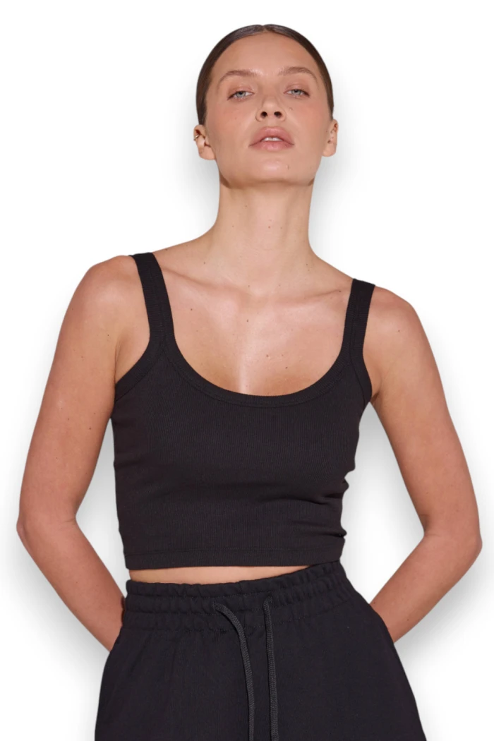 Укорочена майка довжиною до талії чудово пасує до штанів чи спідниць з високою посадкою. Широкі бретелі та прилеглий силует забезпечують зручну фіксацію на тілі. Тканина в рубчик з бавовни приємна на дотик і добре тягнеться. Це простий і стильний варіант для розслаблених образів.